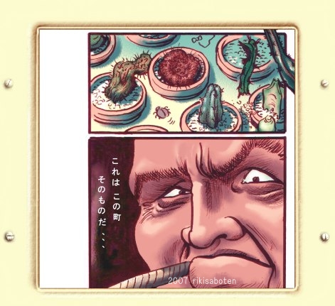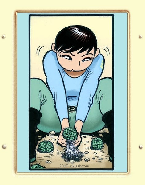 「オタクの温室」より〜森葵、園長の説教を聞きつつサボテン収穫作業の図