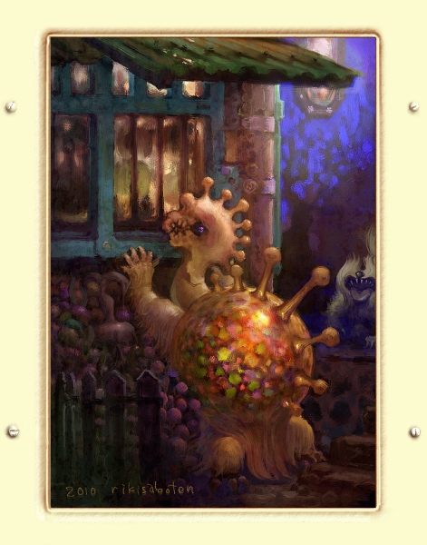 | 「夜の亀はなぜ光る」 お母さん入れてよ ぼくだよ 開けてよ その大亀は泣いて窓を叩きました 野良犬たちが怪しがって吼え始めています 丸太を持ったご近所さんも近づいてきました この亀が実は しょうた君だと誰も気付いてくれません 怖くなったしょうた君は誰も居ない沼へ逃げ込みました しょうた君は外を遊び呆け続けたバチが当って、亀にされてしまったのです ここで一人で暮らすしかないのか、、、と彼は思いました 夜になると甲羅が中から光ります 泣くと自然に光るのです お腹がすいたので、コケを食べてみました また甲羅を光らせながら 町の灯りを遠くに見つめました もう二度と あの町に戻る事は出来ませんでした しょうた君はその後10000年も生き続けたそうです おわり ・ |