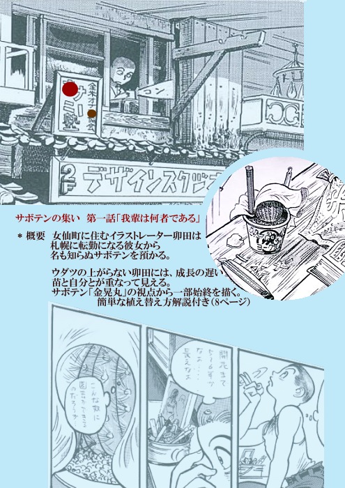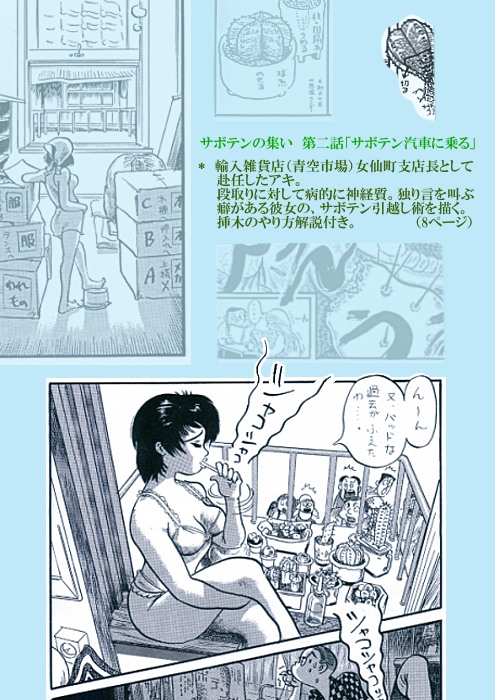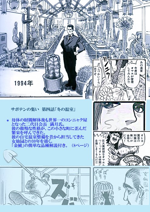 | この短編集「サボテンの集い」は5話作られ、当時原稿を見てもらってた講○社さんへ送 りました。 今のは第3話 1994年4月作でした。 写植文字まで貼ってある事から解るでしょうが、誰かが原稿が間に合わなかったときの 穴埋めか、増刊号での水増し用として保管されてた作品です。 その雑誌自体が廃刊になるとも知らず、私はその他の企画「オタクの温室」「鉄人」等も ガンガって描いておりましたが、、、この数年後に力尽きました。 「M.M」誌のTさん。その節はご尽力頂いたのにヘタレでスンマセンでした。 (T皿T;∩) サボテン栽培は、絵以外では10数年以上続けてる趣味です。 キャラクターが初心者、という設定にして1から学ばせる展開なら、特殊な趣味世界でも漫画の 題材になり得る、、、という考えで描きました。 その他の各話、ダイジェストで==========このページは下へスクロールします ↓ . |