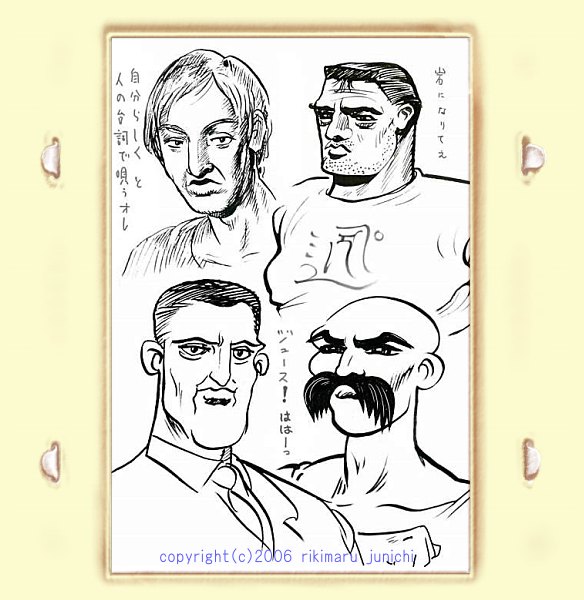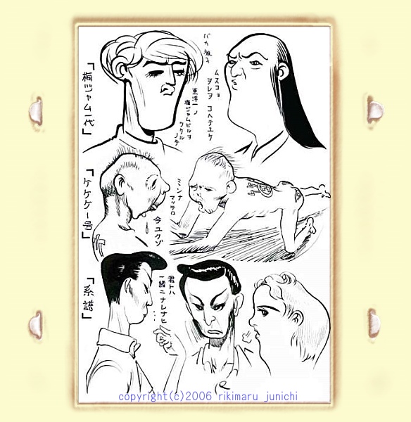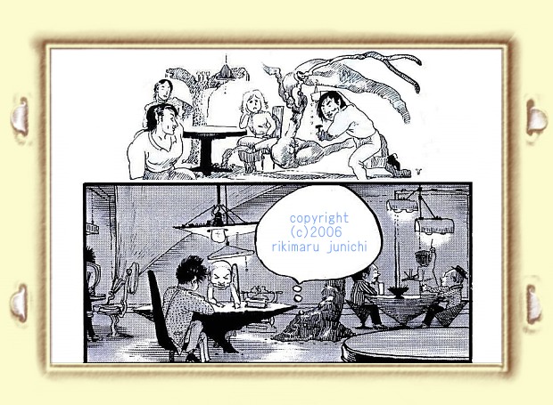 | 漫画「黄金トンネル」より 20歳の時描いた、とりとめも無い話。 脚本を練る作者と、作品内人物の変化を平行描写する漫画。 時々、唐突に舞台劇が挿入される。 |