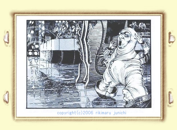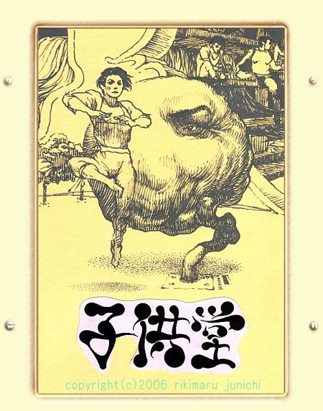 | 漫画雑誌「子供堂」は、「トリロジー」という作品を前後編に分け 全掲載作品の最初と最後を挟む構成、、、、の予定でした。 サージェントペパーズとかプログレのパクリです 珍妙な絵を思いついたから、その場面同士つないじゃえ・・・と言う、 程度の低い発想でした。前衛って言葉に憧れてたんでしょう。 |